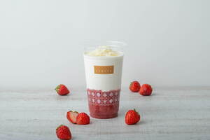 「北海道いちごラテ」は、「すずあかね」の自家製コンフィチュールをたっぷり使用した、果実感満載のいちごラテ。白と赤のカラーコントラストも美しい1杯。