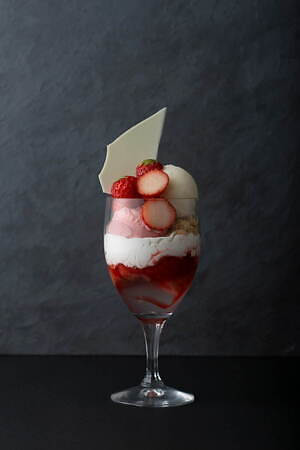 「すずあかね」の果肉入りコンフィチュールにあまおういちごのアイス、北海道ミルクジェラートを重ねた「パフェ 北海道いちご&ミルク」。フレッシュな苺の酸味とミルクの甘みのハーモニーを楽しめる、“いちご尽くし”のパフェだ。