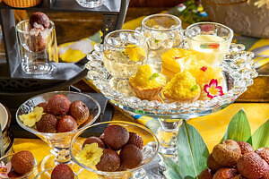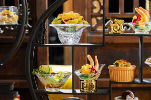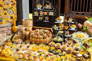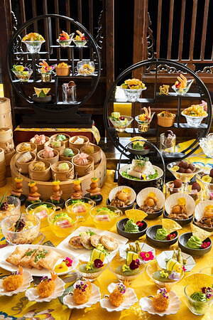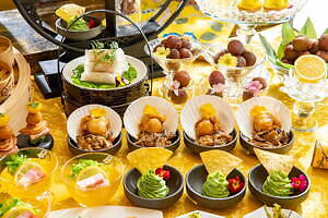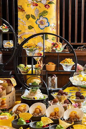 「シノワ・ジョーヌ」は、古代中国の時代よりインペリアル・カラーとして最も高貴な色に位置づけられている“黄色”を基調とした前菜、スープ、肉・海鮮料理、ワゴンサービスの食べ放題点心、4種類の「王朝」特製スイーツプレート、たっぷりのライチを楽しめる贅沢なチャイニーズ・アフタヌーンティー。