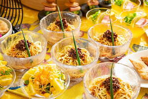前菜、スープ、肉・海鮮料理は、鮑や北海道産ホタテ貝などを贅沢に用い、はちみつ、レモン、バターを隠し味に効かせた10種類を1人1オーダー限りで提供する。黄金色のソースを纏った「海老のスイートチリマヨネーズソース」や「北海道産ホタテ貝の強火蒸しと三種きのこの焦がしバターオイスターソース」などがミニサイズで用意される。