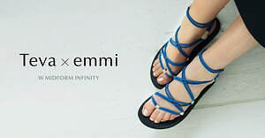 Tevaのサンダル「ミッドフォームインフィニティ」が、emmiとのコラボレーションにより洗練された表情で新登場。地中海をイメージしたブルーカラーをキーワードに、街履きできる大人カワイイサンダルを完成させた。