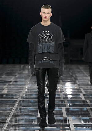 ウィメンズとともに発表された前シーズンでは、フォーマルとカジュアル、日常着とラグジュアリーを折衷したルックを展開した。テーラードジャケットには、ロゴプリントを施したハイネックカットソーを合わせてエッジを効かせ、シャイニーなパンツには、異なる丈にカットしたカットソーをレイヤードしてストリートのエッセンスをプラスした。また、デニムパンツは曲線を描くようにしなやかなシルエットに仕上げ、レザーブルゾンは光沢感のある革ですっきりと仕立てることで上品さを漂わせた。