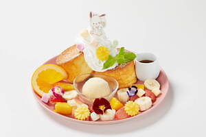 バターの一番人気メニュー「スフレパンケーキ」は、ポチャッコの大好物であるバナナアイスを合わせた「ポチャッコお花の秘密基地パンケーキ」に。お花畑の秘密基地にいるポチャッコをイメージして、エディブルフラワーやフルーツで彩り豊かに仕上げている。