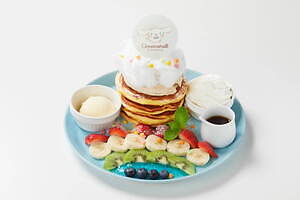 たとえば「シナモロール虹のお空パンケーキ」は、ふわふわの雲の上にいるシナモロールをイメージしたファンタジームード溢れる一品。トッピングには苺やバナナ、キウイ、ブルーベリーなど、虹に見立てたフレッシュフルーツを添えている。