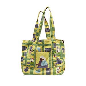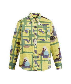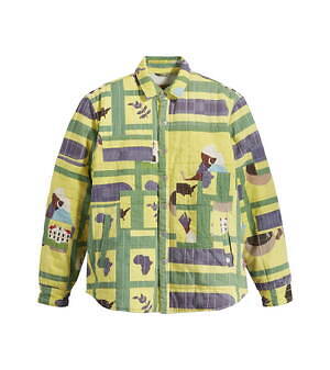 中でも注目は、イエローとグリーンの配色が目を引くアイテム。アメリカとアフリカ大陸のシルエット、インディゴ染めの槽のなかで働く女性のグラフィックを配した大胆なビジュアルがポイントだ。いずれも、ガラ・ギーチー族の職人技術を称えたホワイトのキルティングステッチがアクセントとなっている。
