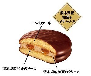 「チョコパイ」シリーズおなじみのしっとりケーキにサンドしたのは、熊本県産和栗のクリーム。クリーム同様に熊本県産和栗を使用した、マロングラッセのような和栗ソースをクリームの中に加えることで、ひと口目からしっかりとした和栗の味わいが楽しめる。