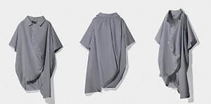 半袖シャツは、曲線を描くように並ぶ前立てボタンの開け閉めによって、アシンメトリーな表情の変化を楽しめる1着。ふんわりとした立体感があり、風通しがよく涼やかに着こなすことができる。