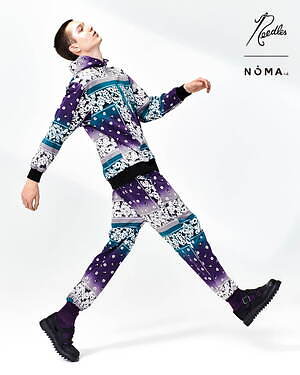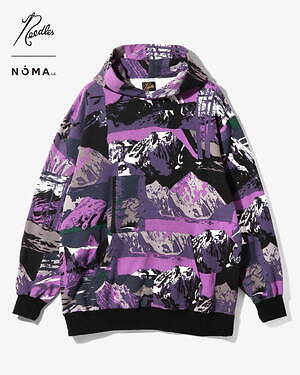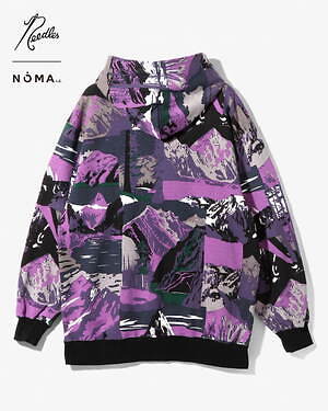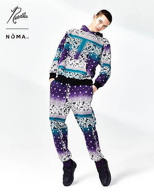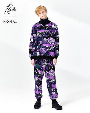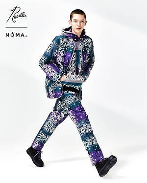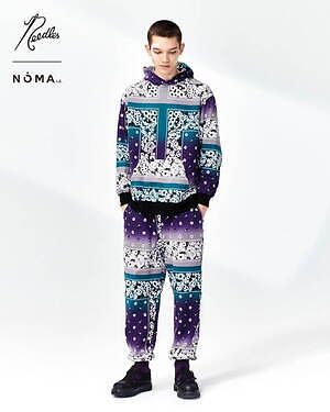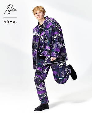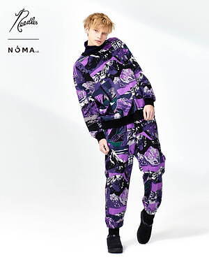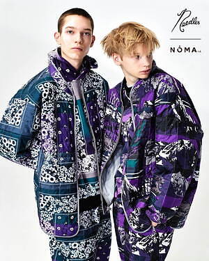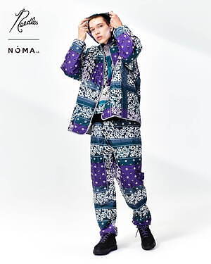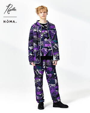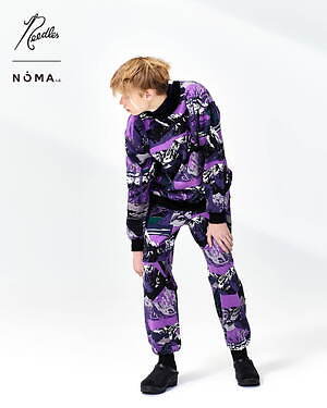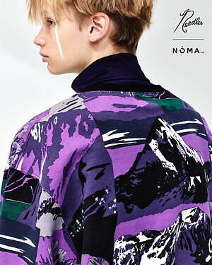 コラボレーションでは、ニードルズのアーカイブからスポーティなウェア5型をベースに、パープルカラーを取り入れたノーマティーディーのオリジナルテキスタイルを採用。テキスタイルの柄には、フラワーモチーフをバンダナ柄のようにアレンジしたものと、ハンドドローイングで描いた山の稜線や森林の風景をパッチワーク風に仕上げたものの2種類を用意する。
