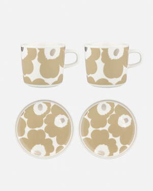 ウニッコ柄は、落ち着いたベージュのウニッコの中に、輝くシルバーカラーをセットしてアクセントをプラス。ギフトボックス入りのカップ&プレートセットや日本限定のハンドルなしコーヒーカップセット、テーブルクロスなど、クリスマスギフトにぴったりな品々を取り揃えた。