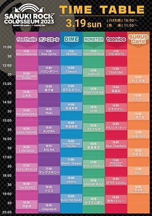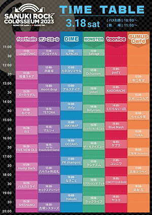 音楽フェス「サヌキロックコロシアム 2022(SANUKI ROCK COLOSSEUM 2023」が、2023年3月18日(土)・19日(日)の2日間、香川県高松市のフェストハレ、オリーブホール、ダイム、モンスター、スムスカフェなどで開催される