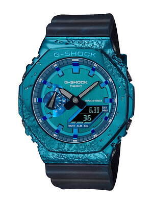 “道を示す”と言われるコーディエライトをモチーフとした「GM-2140GEM」は、八角形のベゼルとシンプルなデザインが人気の「GM-2100」がベース。メタルベゼルとバンドで、美しく輝くコーディエライトのブルーを表現した。ベゼルのゴツゴツとした質感もポイント。
